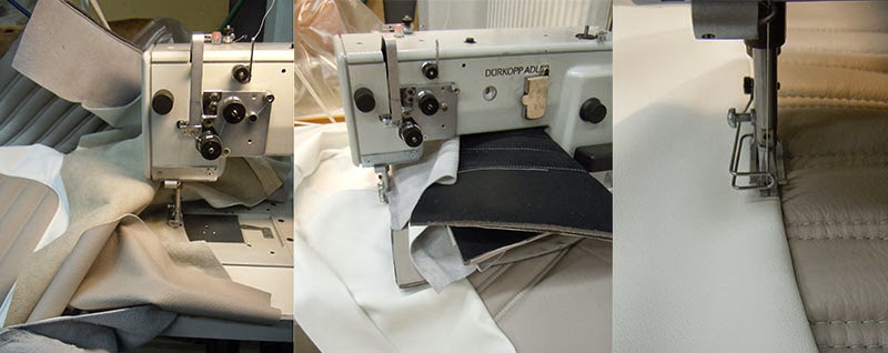 Aloitin etuselkänojan ompelemisen tikkaamalla harmaat nahat. Liimasin 2x8 mm:n laminaattikankaan tikattavan nahan alle, jotta se pysyisi paikoillaan tikkauksen ajan. Oikean väristä ompelulankaa ei koululta valmiina löytynyt, joten kävin hakemassa tukusta sopivan värin. Testasin tikinpituutta ja nahalle ompelua testikappaleeseen. Hermoiltuani tarpeeksi aloitin tikkausten tekemisen. Ensimäinen kappale sujui ilman suurempia ongelmia. Viimeisen rivin aloitus epäonnistui, mutta sain sen korjattua ilman näkyviin jääviä virheitä.
